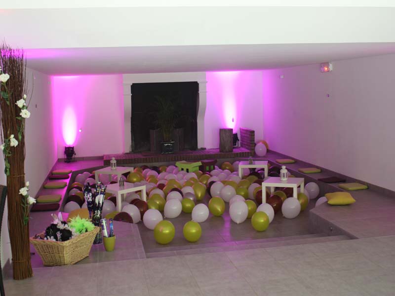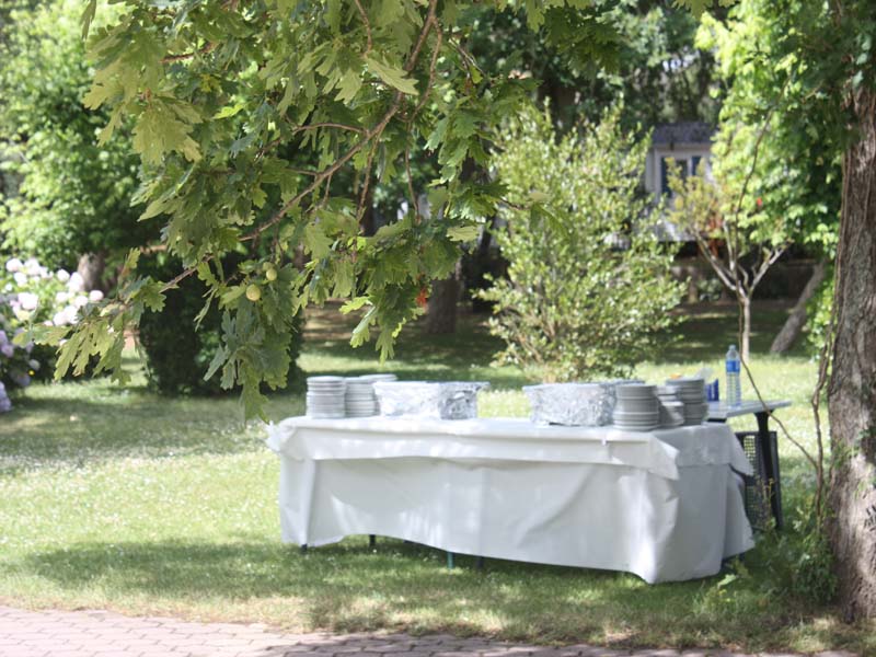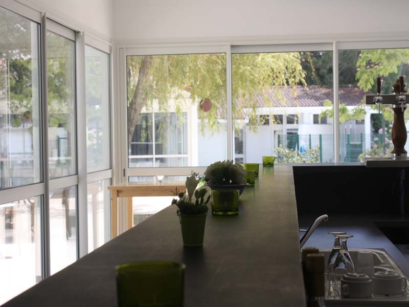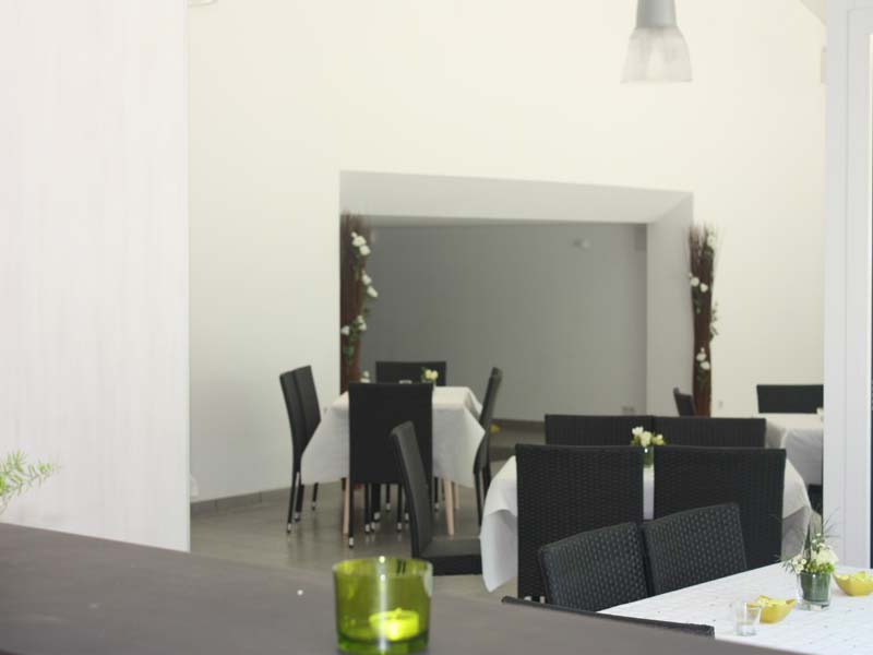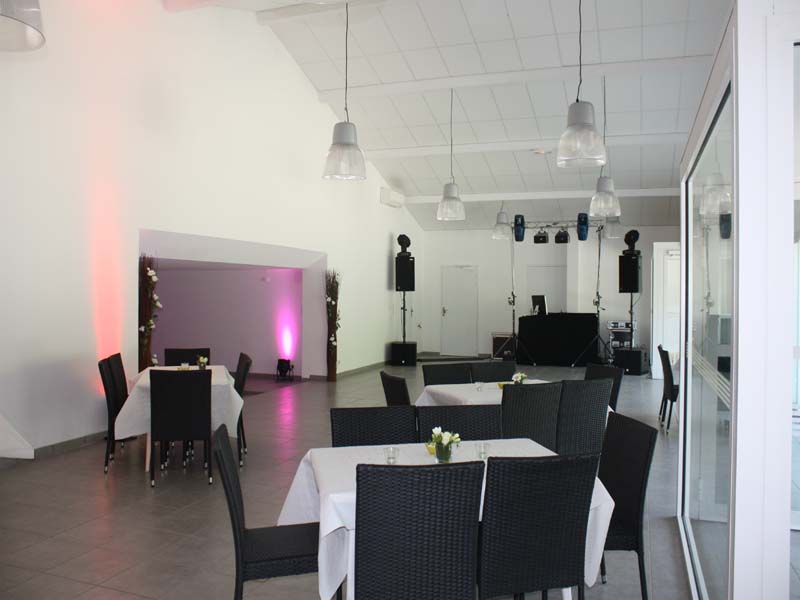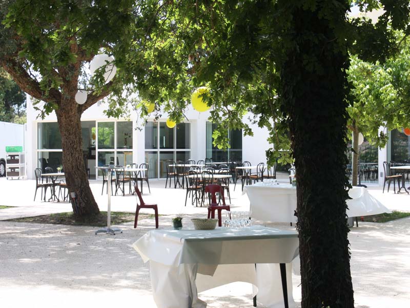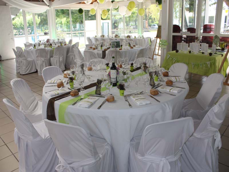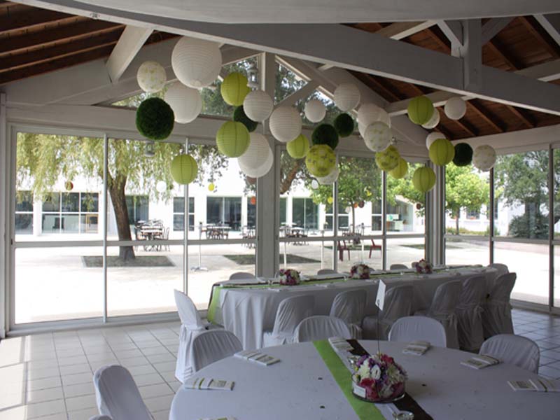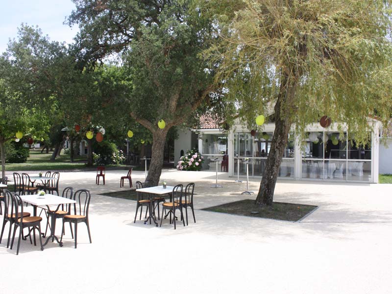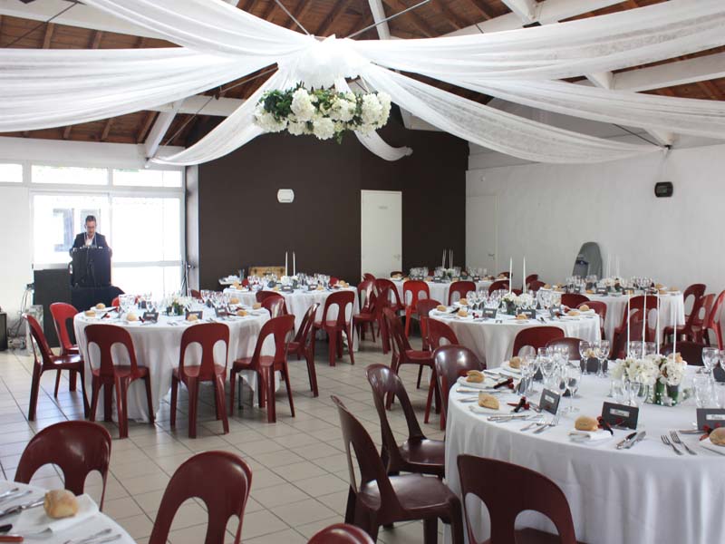 Grande salle de restauration vitrée, donnant sur la piscine, avec terrasse couverte attenante pour le vin d’honneur, salle de soirée entièrement rénovée, hébergements sur place.